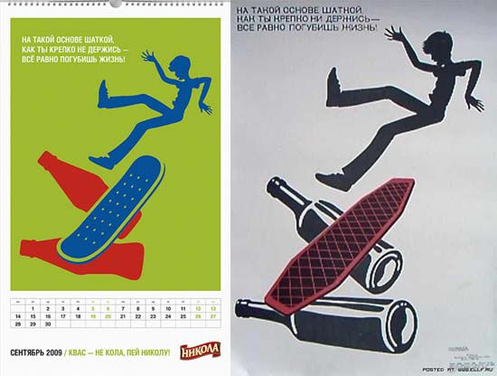 The most spectacular visual manifestation of the anti-alcohol campaigns were undoubtedly the posters, of which about a hundred have survived from the period between 1920 and 1990. Most of them became iconic, and continue to affect if not the alcohol consumption, at least the visual culture of contemporary Russians. This is what I would like to illustrate in this introductory post with twelve examples, mainly from the 1950s, whose paraphrases were used in 2009 in a calendar published by the largest Russian kvass producer, Deka of Novgorod. This calendar was not composed against alcohol, but rather against Coca-Cola, the main rival of Deka in the Russian market– that rivalry is apparent in that Deka calls their most popular kvass “NiKola,” which on the one hand is a widespread Russian male name, but on the other hand means “not Cola” or “anti-Cola.”